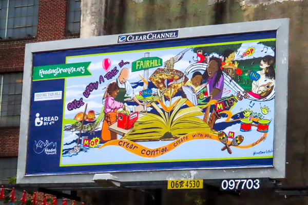 Illustrated for the Fairhill Neighborhood of Philadelphia as part of the Mural Arts Philadelphia "We Will Write the World" Literacy-rich Neighborhood Project, this billboard design was influenced by community workshops, research and our creative process.